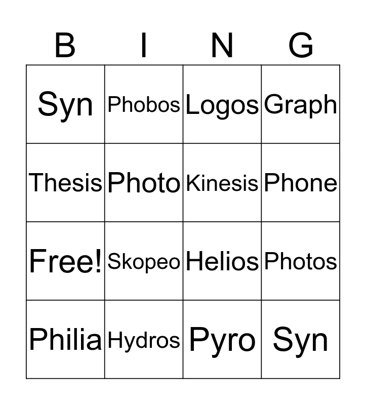 This bingo card has 20 words: Philia, Metron, Logos, Photos, Tele, Skopeo, Pyro, Graph, Free!, Phobos, Helios, Phone, Syn, Hydros, Kinesis, Tropos, Thesis, Photo, Helios and Syn.