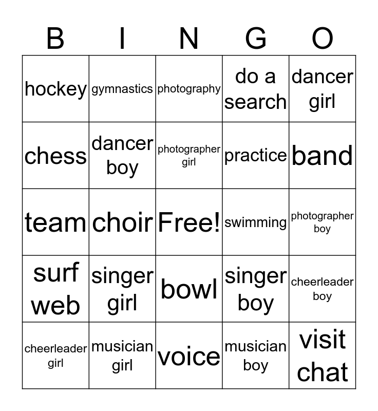 This bingo card has a free space and 24 words: singer girl, musician girl, photographer girl, cheerleader girl, dancer girl, hockey, chess, gymnastics, swimming, bowl, practice, team, singer boy, cheerleader boy, dancer boy, musician boy, photographer boy, photography, band, choir, visit chat, surf web, do a search and voice.