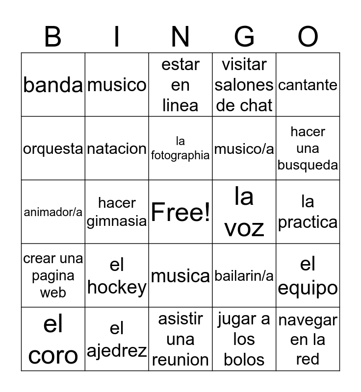This bingo card has a free space and 24 words: el hockey, el ajedrez, la fotographia, el coro, cantante, banda, orquesta, musico, la voz, musica, musico/a, animador/a, bailarin/a, el equipo, natacion, jugar a los bolos, la practica, estar en linea, hacer una busqueda, hacer gimnasia, navegar en la red, crear una pagina web, visitar salones de chat and asistir una reunion.