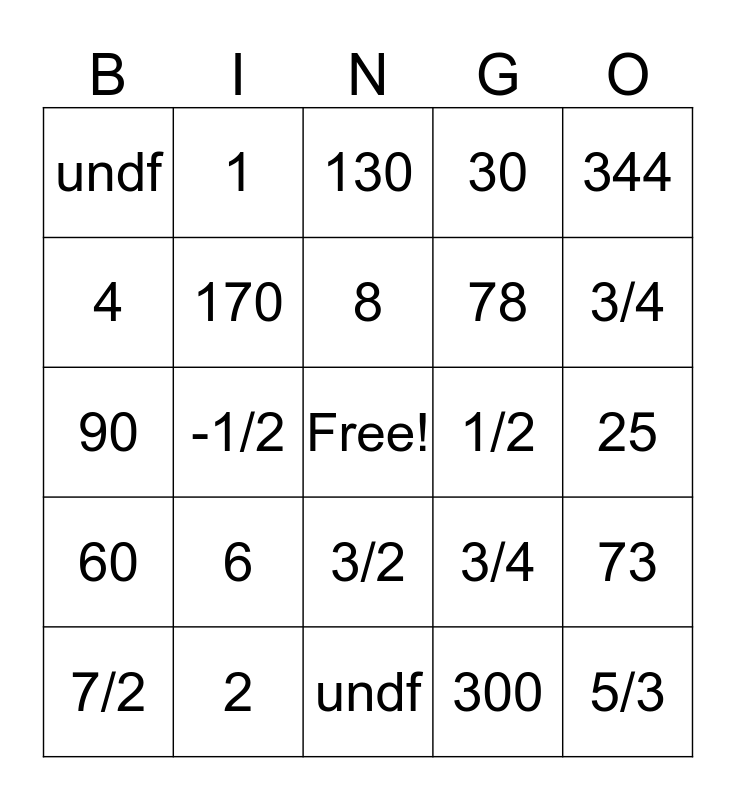 This bingo card has a free space and 24 words: 6, 2, 8, 7/2, 344, undf, 4, 1, 1/2, 3/2, 78, 90, 3/4, 73, 170, 300, 25, 130, 3/4, -1/2, 5/3, 60, 30 and undf.