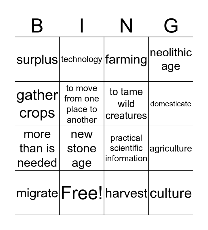 This bingo card has 16 words: Free!, agriculture, farming, surplus, more than is needed, technology, practical scientific information, harvest, gather crops, to move from one place to another, migrate, neolithic age, new stone age, domesticate, to tame wild creatures and culture.