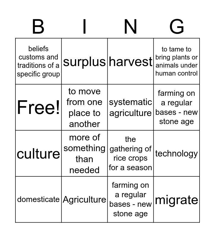 This bingo card has 16 words: Agriculture, technology, harvest, beliefs customs and traditions of a specific group, culture, surplus, the gathering of rice crops for a season, farming on a regular bases - new stone age, Free!, to move from one place to another, domesticate, to tame to bring plants or animals under human control, more of something than needed, farming on a regular bases - new stone age, systematic agriculture and migrate.