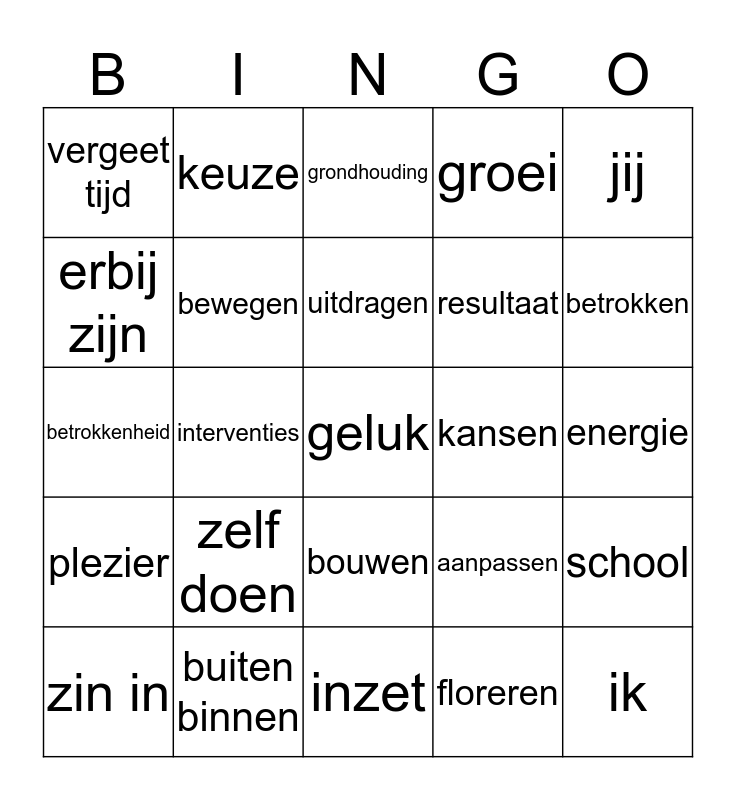 This bingo card has a free space and 34 words: lerend, activiteit, leefregel, wat goed gaat, energie, erbij zijn, bewegen, inzet, resultaat, ik, betrokkenheid, keuze, floreren, visie, plezier, interventies, bouwen, kansen, school, zin in, buiten binnen, eigen, groei, betrokken, flow, zelf doen, grondhouding, contacten, jij, vergeet tijd, maken, uitdragen, aanpassen and inrichting.