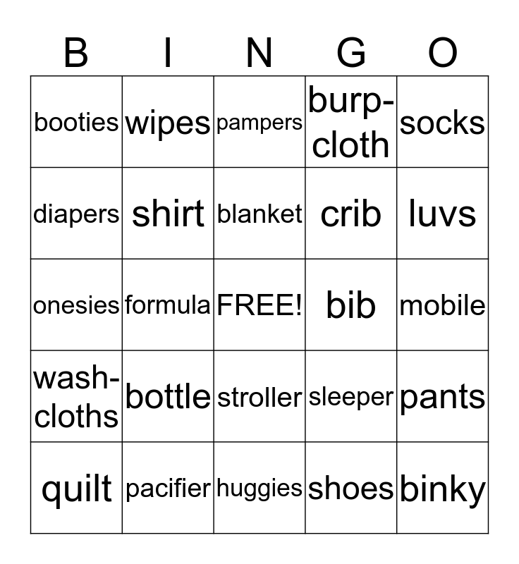 This bingo card has a free space and 24 words: bottle, pacifier, blanket, quilt, socks, booties, diapers, wipes, bib, stroller, crib, onesies, sleeper, pants, shirt, shoes, mobile, pampers, luvs, formula, binky, wash-cloths, burp-cloth and huggies.