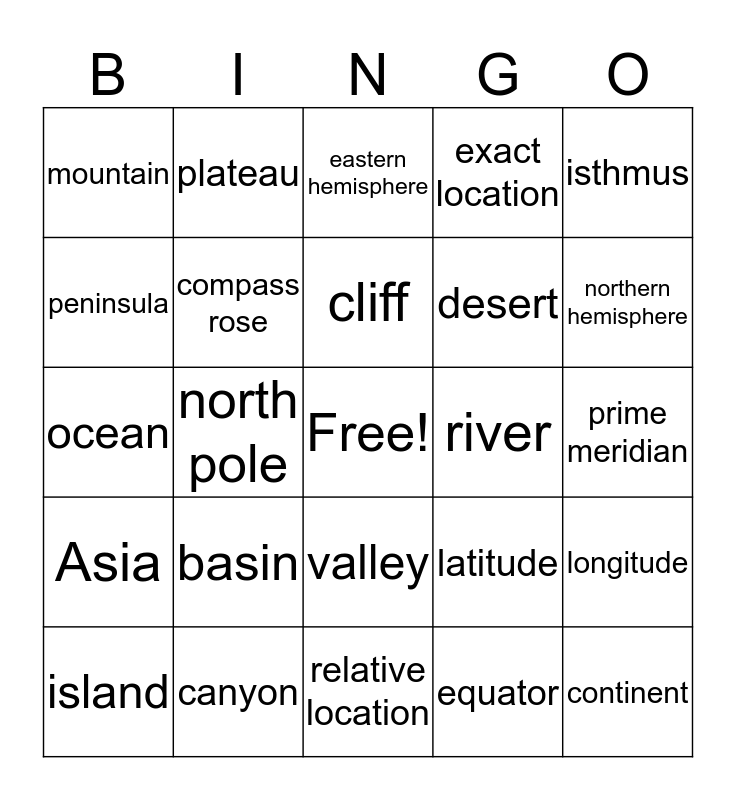 This bingo card has a free space and 24 words: basin, canyon, cliff, island, isthmus, mountain, peninsula, plateau, river, valley, desert, ocean, latitude, longitude, compass rose, equator, prime meridian, eastern hemisphere, northern hemisphere, north pole, continent, Asia, exact location and relative location.