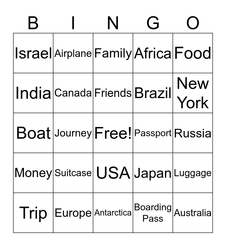 This bingo card has a free space and 34 words: Spain, Boarding Pass, Paris, Italy, Money, Canada, Food, Trip, Airplane, Take off, Friends, Family, Ukraine, Land, Passport, New York, Europe, Boat, Suitcase, Japan, USA, Explore, Israel, Russia, Antarctica, Australia, Africa, Security, Brazil, India, Adventure, Journey, Luggage and China.