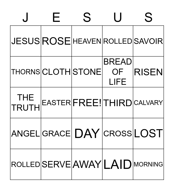This bingo card has a free space and 24 words: GRACE, SERVE, STONE, ROLLED, SAVOIR, JESUS, THORNS, ROSE, THIRD, DAY, BREAD OF LIFE, THE TRUTH, CROSS, LOST, CLOTH, LAID, CALVARY, HEAVEN, RISEN, EASTER, MORNING, ANGEL, ROLLED and AWAY.