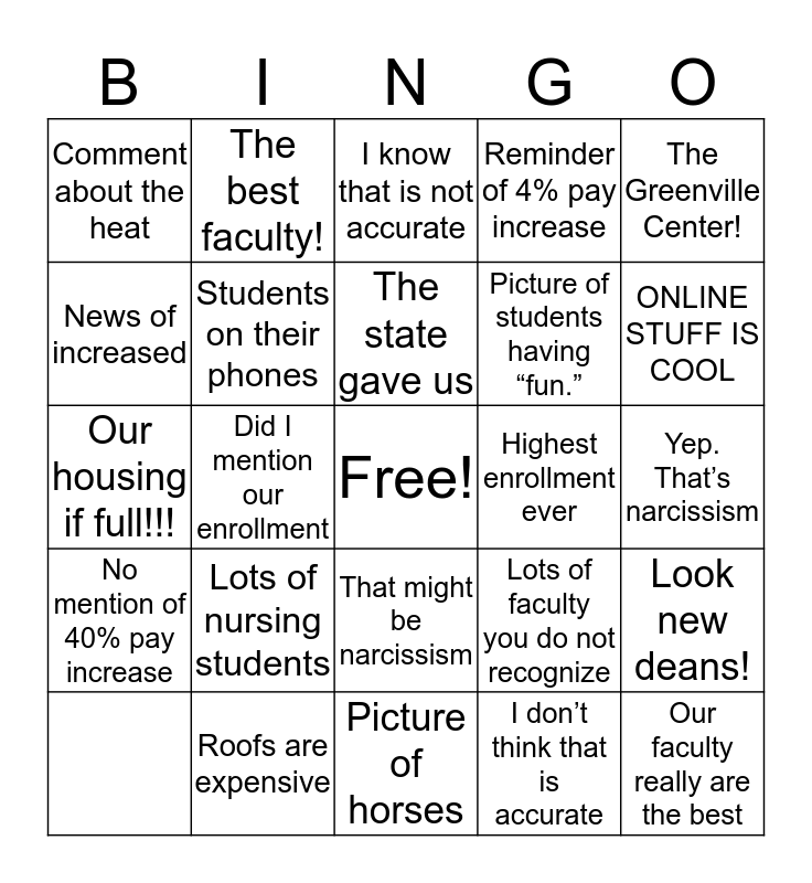 This bingo card has a free space and 23 words: Lots of nursing students, The state gave us, I don’t think that is accurate, The Greenville Center!, Comment about the heat, The best faculty!, I know that is not accurate, Highest enrollment ever, Yep. That’s narcissism, Our housing if full!!!, Students on their phones, Lots of faculty you do not recognize, Look new deans!, News of increased, Roofs are expensive, Picture of horses, Reminder of 4% pay increase, ONLINE STUFF IS COOL, No mention of 40% pay increase, Did I mention our enrollment, That might be narcissism, Picture of students having “fun.” and Our faculty really are the best.