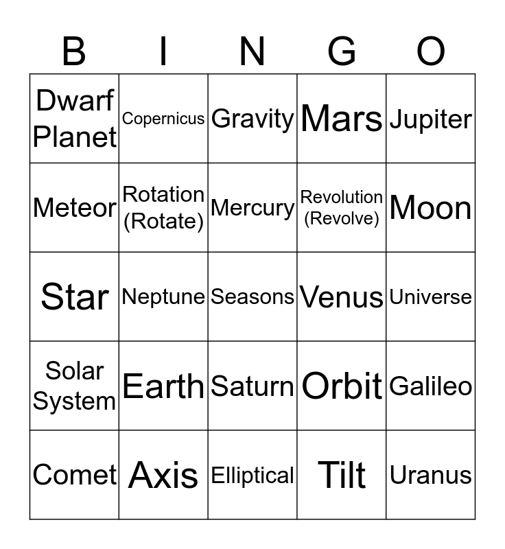 This bingo card has 25 words: Earth, Elliptical, Mercury, Comet, Jupiter, Dwarf Planet, Meteor, Copernicus, Venus, Saturn, Revolution (Revolve), Star, Orbit, Galileo, Rotation (Rotate), Uranus, Universe, Gravity, Moon, Neptune, Seasons, Axis, Solar System, Mars and Tilt.