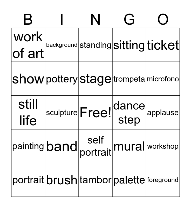 This bingo card has a free space and 24 words: band, brush, stage, portrait, ticket, work of art, show, background, dance step, self portrait, trompeta, still life, mural, workshop, pottery, palette, applause, standing, microfono, sculpture, foreground, painting, sitting and tambor.