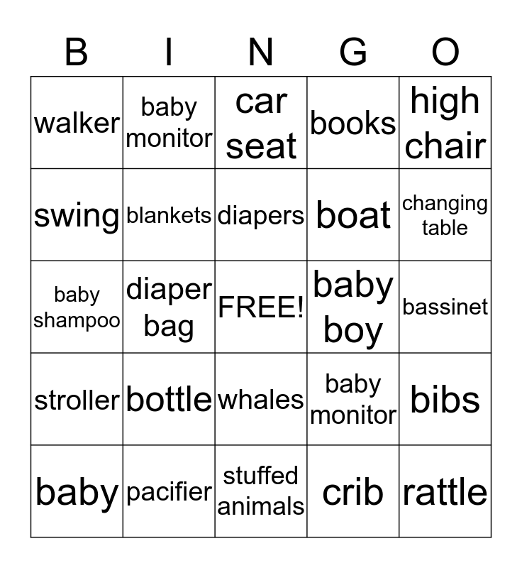 This bingo card has a free space and 24 words: bottle, pacifier, diapers, baby, high chair, walker, swing, baby monitor, baby boy, whales, boat, baby shampoo, baby monitor, bibs, blankets, crib, bassinet, car seat, changing table, diaper bag, rattle, stroller, books and stuffed animals.