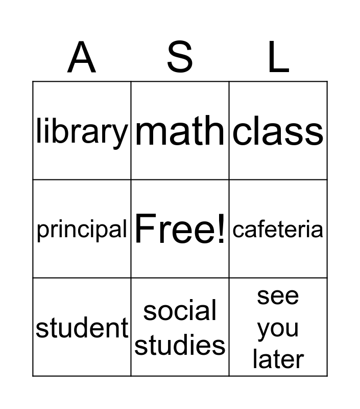 This bingo card has a free space and 14 words: school, teacher, student, math, principal, see you later, today/now, homework, social studies, library, good evening, cafeteria, class and How are you?.