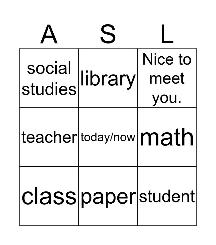 This bingo card has a free space and 13 words: school, principal, class, library, teacher, student, music, cafeteria, paper, social studies, math, Nice to meet you. and Good evening.