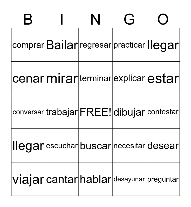 This bingo card has a free space and 24 words: escuchar, cantar, terminar, viajar, llegar, comprar, cenar, Bailar, dibujar, buscar, explicar, conversar, necesitar, desear, mirar, desayunar, contestar, regresar, estar, trabajar, preguntar, llegar, practicar and hablar.