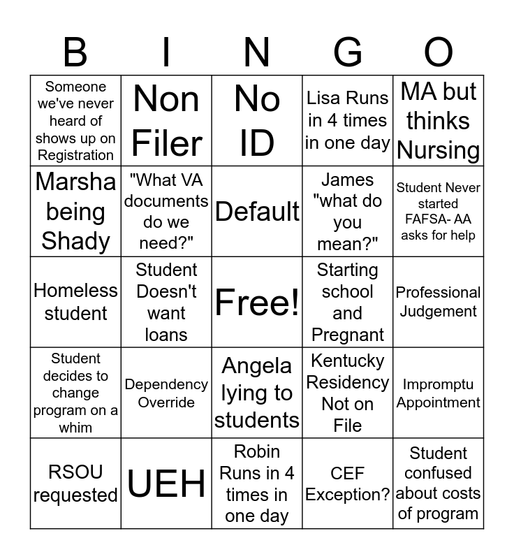 This bingo card has a free space and 24 words: Dependency Override, UEH, Default, RSOU requested, MA but thinks Nursing, Someone we've never heard of shows up on Registration, Marsha being Shady, Non Filer, Starting school and Pregnant, Angela lying to students, James "what do you mean?", Homeless student, Kentucky Residency Not on File, Impromptu Appointment, "What VA documents do we need?", CEF Exception?, Professional Judgement, No ID, Student Never started FAFSA- AA asks for help, Student Doesn't want loans, Student confused about costs of program, Student decides to change program on a whim, Lisa Runs in 4 times in one day and Robin Runs in 4 times in one day.