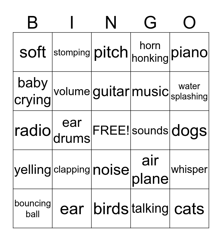 This bingo card has a free space and 30 words: ear, sound waves, ear drums, loud, soft, pitch, volume, noise, sounds, birds, dogs, cats, talking, vibrations, water splashing, phone ringing, air plane, yelling, clapping, piano, radio, TV, stomping, music, baby crying, horn honking, whisper, bouncing ball, guitar and computer volume.