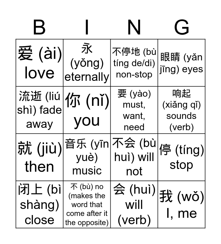 This bingo card has 16 words: 不 (bù) no (makes the word that come after it the opposite), 停 (tíng) stop, 不停地 (bù tíng de/di) non-stop, 爱 (ài) love, 就 (jiù) then, 永 (yǒng) eternally, 不会 (bù huì) will not, 会 (huì) will (verb), 流逝 (liú shì) fade away, 你 (nǐ) you, 闭上 (bì shàng) close, 眼睛 (yǎn jīng) eyes, 音乐 (yīn yuè) music, 响起 (xiǎng qǐ) sounds (verb), 要 (yào) must, want, need and 我 (wǒ) I, me.