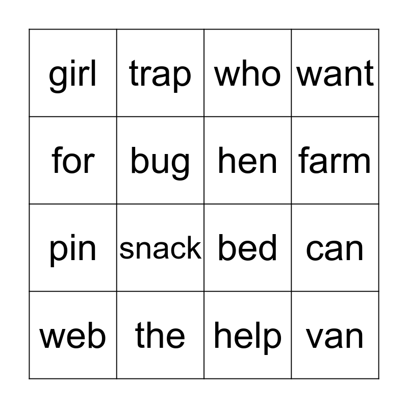 This bingo card has 16 words: the, can, who, girl, pin, trap, bed, help, for, bug, web, want, snack, farm, hen and van.