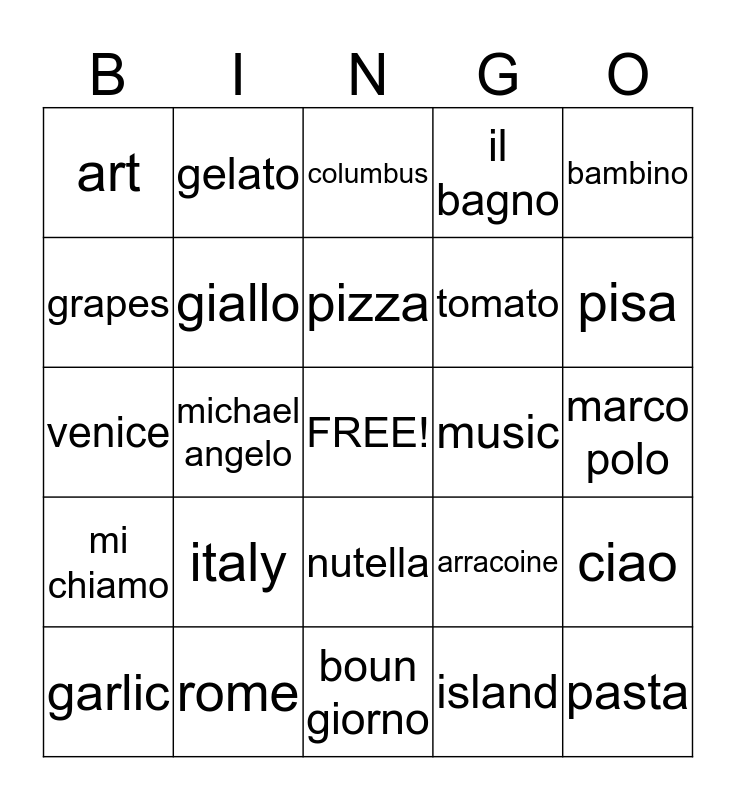 This bingo card has a free space and 24 words: italy, rome, pizza, garlic, bambino, art, grapes, gelato, music, nutella, tomato, venice, arracoine, ciao, giallo, island, marco polo, columbus, pisa, michael angelo, pasta, mi chiamo, il bagno and boun giorno.