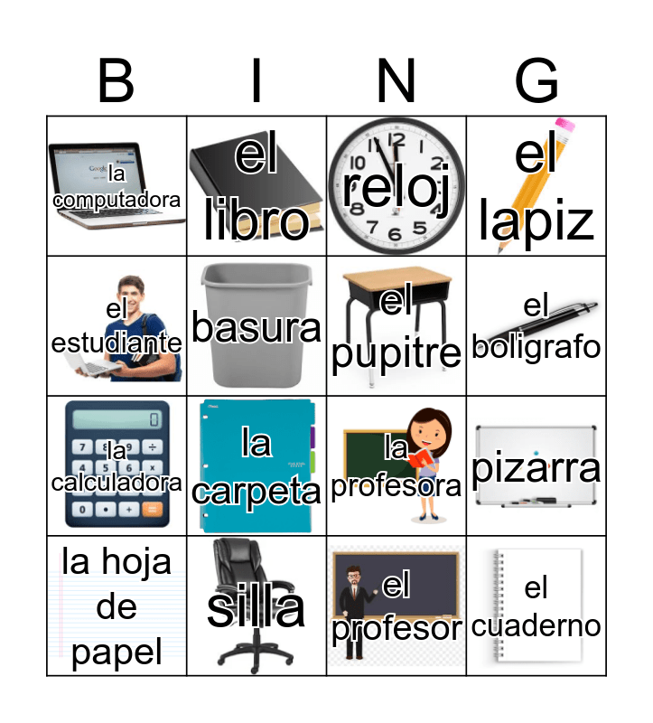 This bingo card has 16 images and 16 words: silla, pizarra, reloj, la computadora, la calculadora, el libro, la profesora, el profesor, el estudiante, basura, la hoja de papel, el lapiz, la carpeta, el boligrafo, el pupitre and el cuaderno.