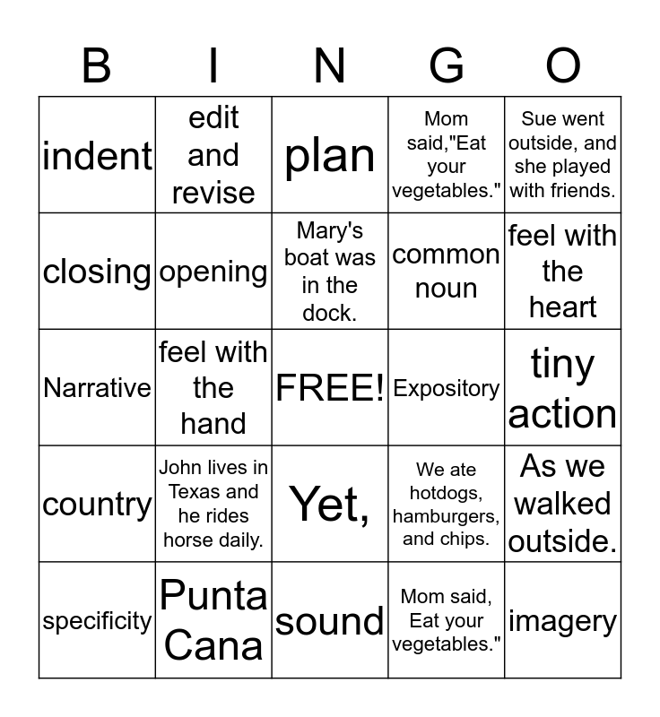 This bingo card has a free space and 24 words: John lives in Texas and he rides horse daily., Punta Cana, Mary's boat was in the dock., specificity, Sue went outside, and she played with friends., indent, closing, edit and revise, Expository, Yet,, common noun, Narrative, We ate hotdogs, hamburgers, and chips., As we walked outside., opening, Mom said, Eat your vegetables.", tiny action, plan, feel with the heart, feel with the hand, imagery, country, Mom said,"Eat your vegetables." and sound.