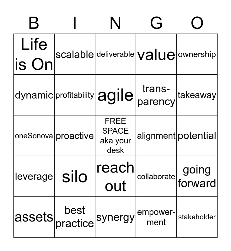 This bingo card has a free space and 24 words: silo, best practice, agile, assets, ownership, Life is On, dynamic, scalable, alignment, reach out, trans-parency, oneSonova, collaborate, going forward, profitability, empower-ment, potential, deliverable, takeaway, proactive, stakeholder, leverage, value and synergy.