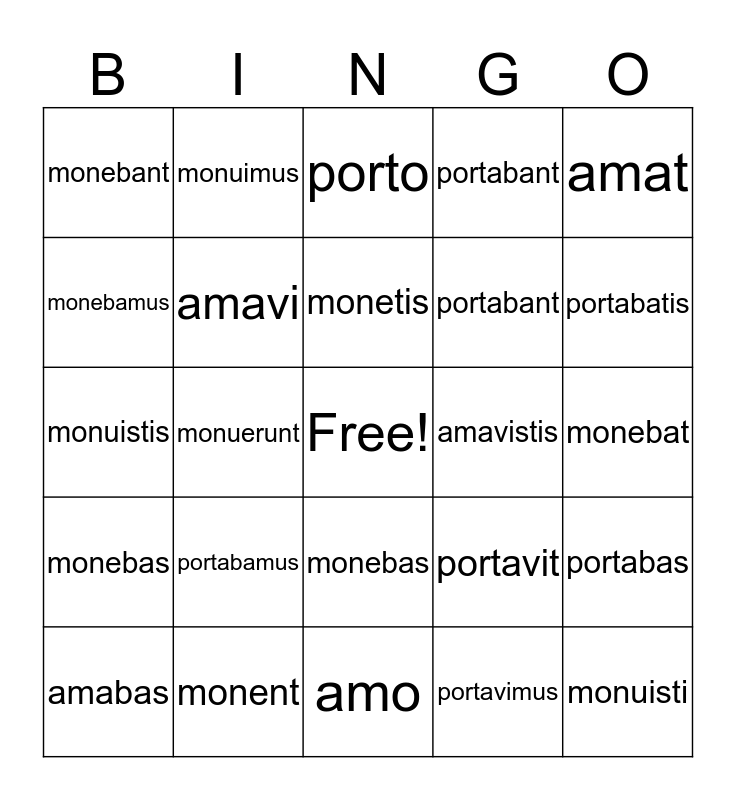 This bingo card has a free space and 104 words: amo, amas, amat, amamus, amatis, amant, amabam, amabas, amabat, amabamus, amabatis, amabant, amavi, amavisti, amavistis, amaverunt, porto, portas, portat, portamus, portatis, portant, portabam, portabas, portabat, portabamus, portabatis, portabant, portavi, portavisti, portavit, portavimus, portavistis, portaverunt, moneo, mones, monet, monemus, monetis, monent, monebam, monebas, monebat, monebamus, monebatis, monebant, monui, monuisti, monuit, monuimus, monuistis, monuerunt, moneo, mones, monet, monemus, monetis, monent, monebam, monebas, monebat, monebamus, monebatis, monebant, monui, monuisti, monuit, monuimus, monuistis, monuerunt, amo, amas, amat, amamus, amatis, amant, amabam, amabas, amabat, amabamus, amabatis, amabant, amavi, amavisti, amavistis, amaverunt, porto, portas, portat, portamus, portatis, portant, portabam, portabas, portabat, portabamus, portabatis, portabant, portavi, portavisti, portavit, portavimus, portavistis and portaverunt.
