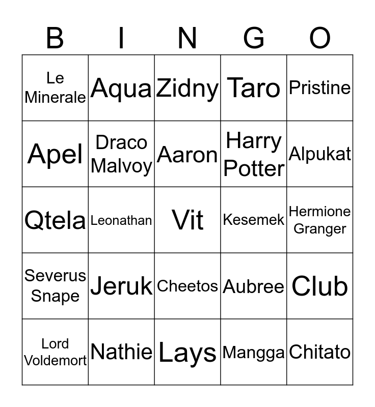 This bingo card has 25 words: Jeruk, Lays, Aaron, Lord Voldemort, Pristine, Le Minerale, Apel, Aqua, Kesemek, Cheetos, Harry Potter, Qtela, Aubree, Club, Draco Malvoy, Chitato, Hermione Granger, Zidny, Alpukat, Leonathan, Vit, Nathie, Severus Snape, Taro and Mangga.