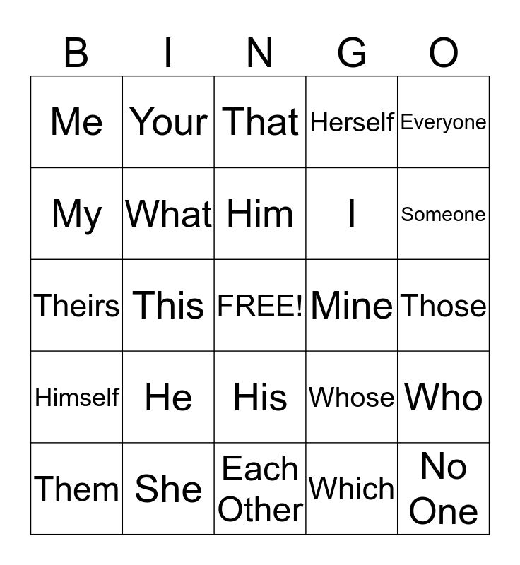 This bingo card has a free space and 24 words: He, She, Him, Them, Everyone, Me, My, Your, Mine, His, I, Theirs, Whose, Who, What, Which, Those, That, Someone, This, No One, Himself, Herself and Each Other.