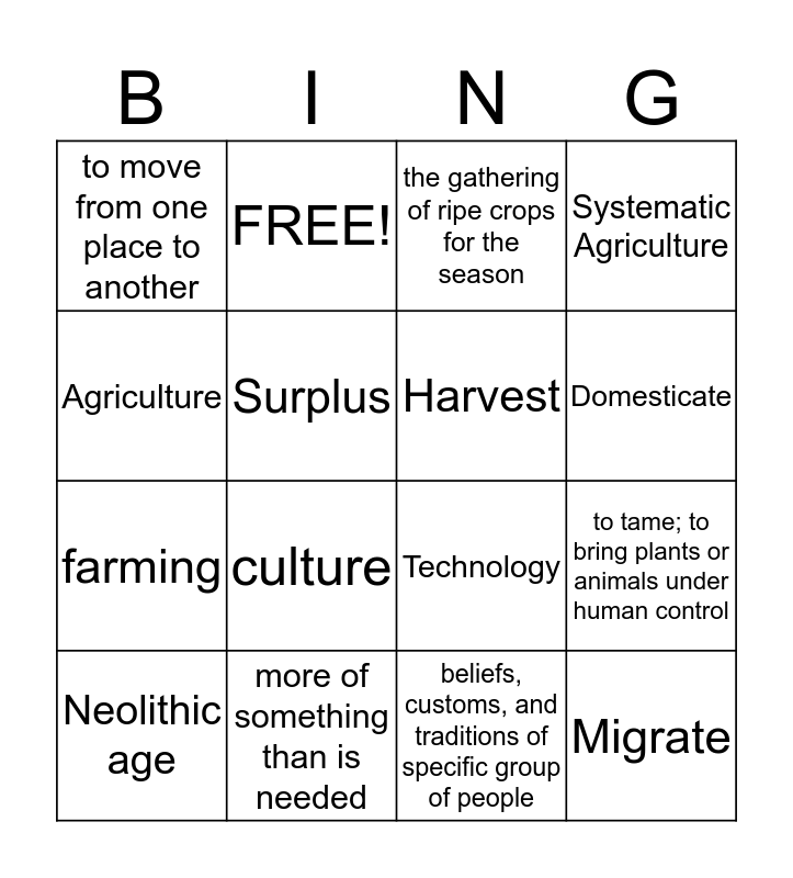 This bingo card has 16 words: more of something than is needed, to tame; to bring plants or animals under human control, the gathering of ripe crops for the season, to move from one place to another, farming, FREE!, Technology, beliefs, customs, and traditions of specific group of people, Agriculture, Surplus, Neolithic age, Systematic Agriculture, culture, Domesticate, Harvest and Migrate.