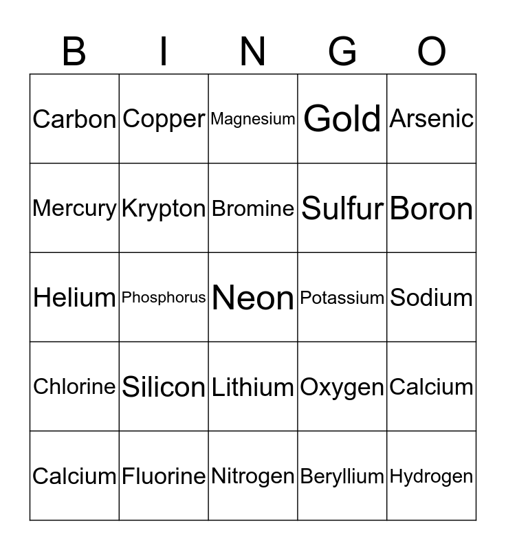 This bingo card has a free space and 29 words: Calcium, Aluminum, Phosphorus, Argon, Carbon, Magnesium, Krypton, Silicon, Potassium, Fluorine, Sodium, Hydrogen, Nitrogen, Beryllium, Boron, Francium, Lithium, Chlorine, Arsenic, Helium, Oxygen, Xenon, Sulfur, Mercury, Gold, Copper, Calcium, Bromine and Iodine.