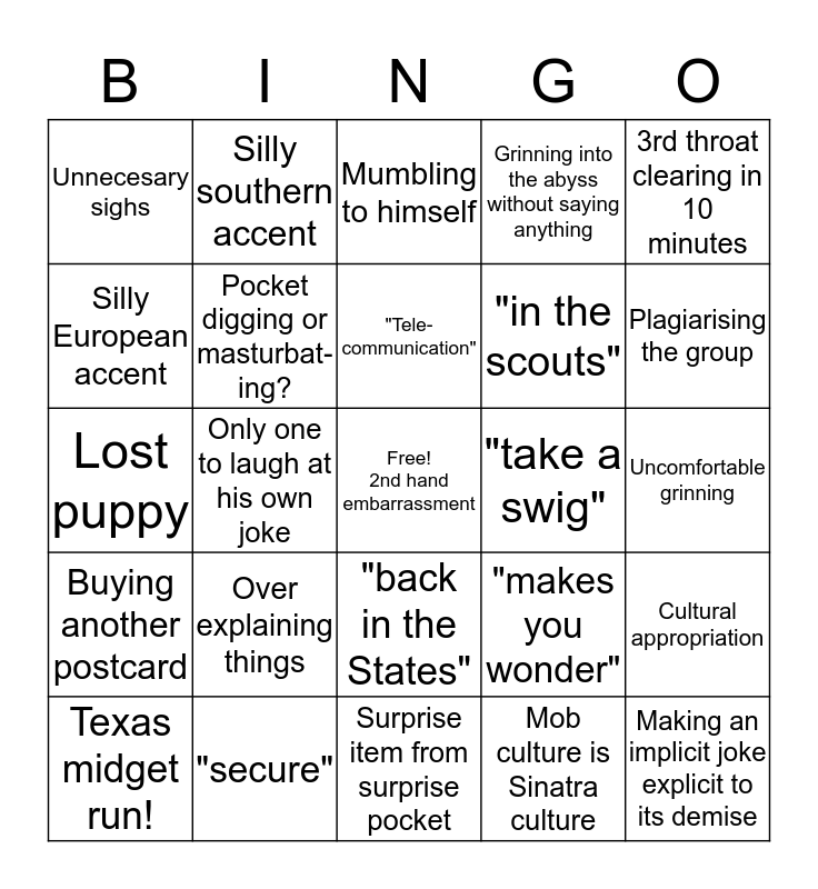 This bingo card has a free space and 25 words: Over explaining things, Surprise item from surprise pocket, "Tele-communication", Texas midget run!, 3rd throat clearing in 10 minutes, Unnecesary sighs, Silly European accent, Silly southern accent, "take a swig", "back in the States", "in the scouts", Lost puppy, "makes you wonder", Cultural appropriation, Pocket digging or masturbat-ing?, "Hard earned money", Uncomfortable grinning, Mumbling to himself, Plagiarising the group, Only one to laugh at his own joke, Making an implicit joke explicit to its demise, "secure", Buying another postcard, Grinning into the abyss without saying anything and Mob culture is Sinatra culture.