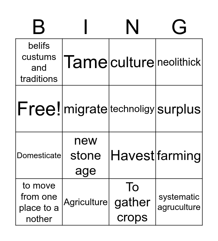 This bingo card has 16 words: Agriculture, farming, culture, belifs custums and traditions, Domesticate, Tame, Havest, To gather crops, Free!, migrate, to move from one place to a nother, neolithick, new stone age, surplus, technoligy and systematic agruculture.