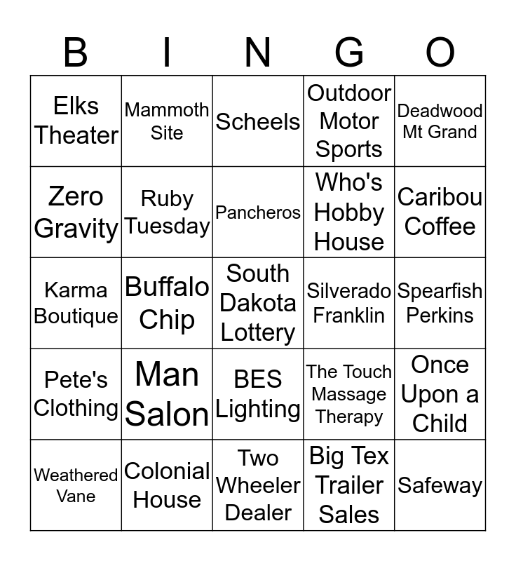 This bingo card has a free space and 39 words: Mineral Palace, 5th & Main Furniture, BH Harley Davidson, Ruby Tuesday, Weathered Vane, BES Lighting, Pancheros, Lodge at Deadwood, Deadwood Mt Grand, Pete's Clothing, Buffalo Chip, Outdoor Motor Sports, Safeway, Spearfish Perkins, Silverado Franklin, Man Salon, BHFCU, Elks Theater, Rushmore Mall, The Touch Massage Therapy, Zero Gravity, Two Wheeler Dealer, Who's Hobby House, Caribou Coffee, Holiday Gas Station, Stanley Steemer, Pink Boutique, Rapid Chevy, Journey Museum, Mammoth Site, Loud American, Scott Peterson Motors, Scheels, Colonial House, Big Tex Trailer Sales, Minervas, Once Upon a Child, Karma Boutique and Headlines Academy.