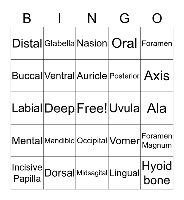 This bingo card has a free space and 24 words: Mandible, Dorsal, Auricle, Incisive Papilla, Foramen, Distal, Buccal, Glabella, Uvula, Occipital, Posterior, Labial, Vomer, Foramen Magnum, Ventral, Lingual, Ala, Nasion, Axis, Deep, Hyoid bone, Mental, Oral and Midsagital.