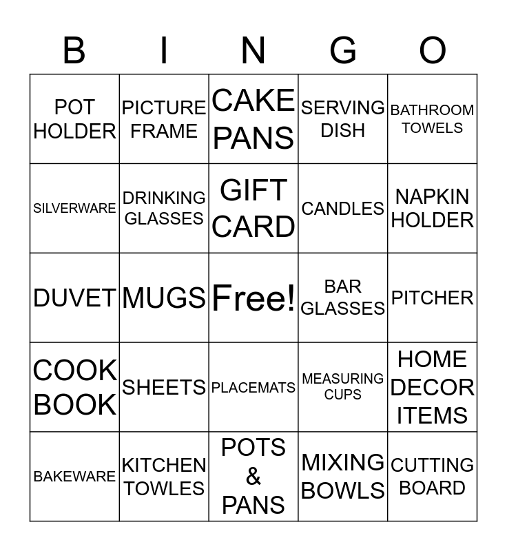 This bingo card has a free space and 24 words: SHEETS, KITCHEN TOWLES, GIFT CARD, BAKEWARE, BATHROOM TOWELS, POT HOLDER, SILVERWARE, PICTURE FRAME, BAR GLASSES, PLACEMATS, CANDLES, DUVET, MEASURING CUPS, HOME DECOR ITEMS, DRINKING GLASSES, MIXING BOWLS, PITCHER, CAKE PANS, NAPKIN HOLDER, MUGS, CUTTING BOARD, COOK BOOK, SERVING DISH and POTS & PANS.