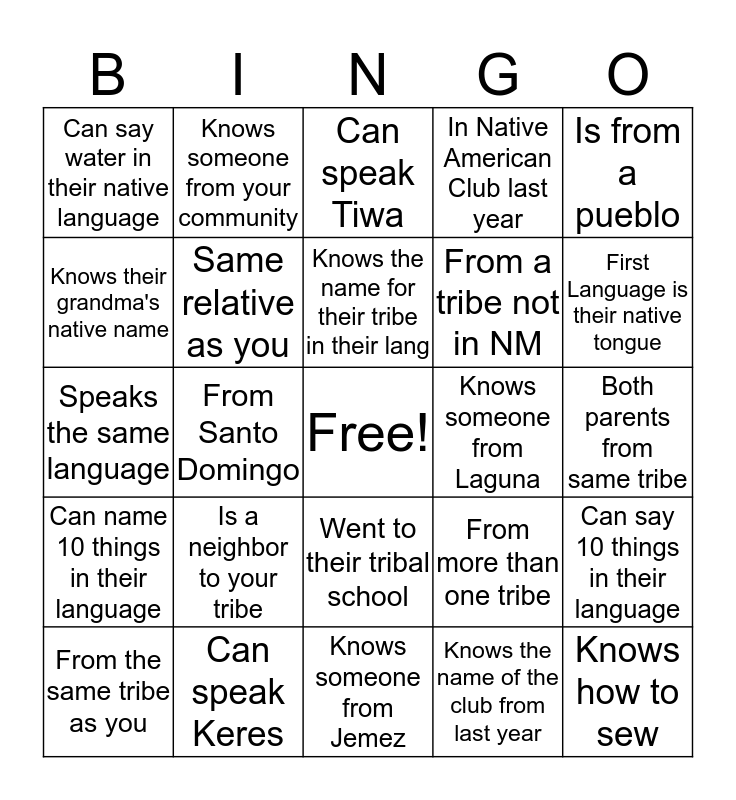 This bingo card has a free space and 24 words: From the same tribe as you, Is a neighbor to your tribe, Knows the name for their tribe in their lang, Knows the name of the club from last year, Is from a pueblo, Can say water in their native language, Knows someone from your community, Can speak Tiwa, Knows someone from Laguna, Both parents from same tribe, Speaks the same language, Same relative as you, From more than one tribe, Can say 10 things in their language, Knows their grandma's native name, Can speak Keres, Knows someone from Jemez, In Native American Club last year, First Language is their native tongue, Can name 10 things in their language, From Santo Domingo, Went to their tribal school, From a tribe not in NM and Knows how to sew.