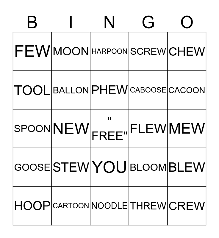 This bingo card has a free space and 24 words: STEW, CARTOON, PHEW, HOOP, CHEW, FEW, TOOL, MOON, FLEW, YOU, CABOOSE, SPOON, BLOOM, BLEW, BALLON, THREW, MEW, HARPOON, CACOON, NEW, CREW, GOOSE, SCREW and NOODLE.
