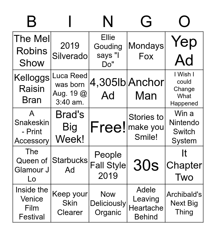 This bingo card has a free space and 29 words: Inside the Venice Film Festival, Serena Holds Court, Brad's Big Week!, Scoop, The Mel Robins Show, Ellie Gouding says "I Do", Luca Reed was born Aug. 19 @ 3:40 am., Starbucks Ad, Stories to make you Smile!, Keep your Skin Clearer, Win a Nintendo Switch System, Archibald's Next Big Thing, Now Deliciously Organic, Adele Leaving Heartache Behind, I Wish I could Change What Happened, Sheryl Crow What I Know Now, People Fall Style 2019, The Queen of Glamour J Lo, Yep Ad, A Snakeskin - Print Accessory, 30s, Habanero Chicken Wings, Anchor Man, Kelloggs Raisin Bran, Mondays Fox, 2019 Silverado, It Chapter Two, 4,305lb Ad and Aquaman's Unlikely Accessory.