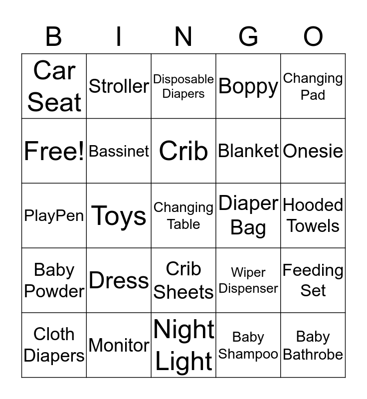 This bingo card has 61 words: Bath Tub, Monitor, Baby Ointment, Baby Powder, Baby Shampoo, Baby Wipes, Bassinet, Bibs, Blanket, Booties, Boppy, Bottles, Free!, Hair Bows, Burp Cloths, Car Seat, Changing Table, Changing Pad, Cradle, Crib, Diaper Bag, Disposable Diapers, Cloth Diapers, Feeding Set, High Chair, Infant Carrier, Formula, Mobile, Onesie, Pacifier, Rattle, Safety Gate, Sippy Cup, Steam Sterilizer, Stroller, Stuffed Animal, Teething Ring, Toys, MaMaRoo, PlayPen, Socks, Dress, Hooded Towels, Wash Cloths, Wiper Dispenser, Diaper Backpack, Swing, Rocking Chair, Dresser, Crib Sheets, Night Light, Baby Tylenol, Thermo- meter, Nail Clipper, Comb & Brush Set, Q-Tips, Hand Sanitizer, Baby Proofing Kit, Book, Baby Bathrobe and Jacket.