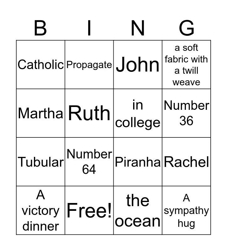 This bingo card has 24 words: Are You a Hindu?, Buddhism, Number 36, Number 59, Martha, Catholic, Ruth, Propagate, Free!, Duvetyn, Tubular, Piranha, ISKCON, ashtray, in college, the park, the ocean, John, Number 64, Rachel, A victory dinner, A sympathy hug, a soft fabric with a twill weave and maybe not this year....