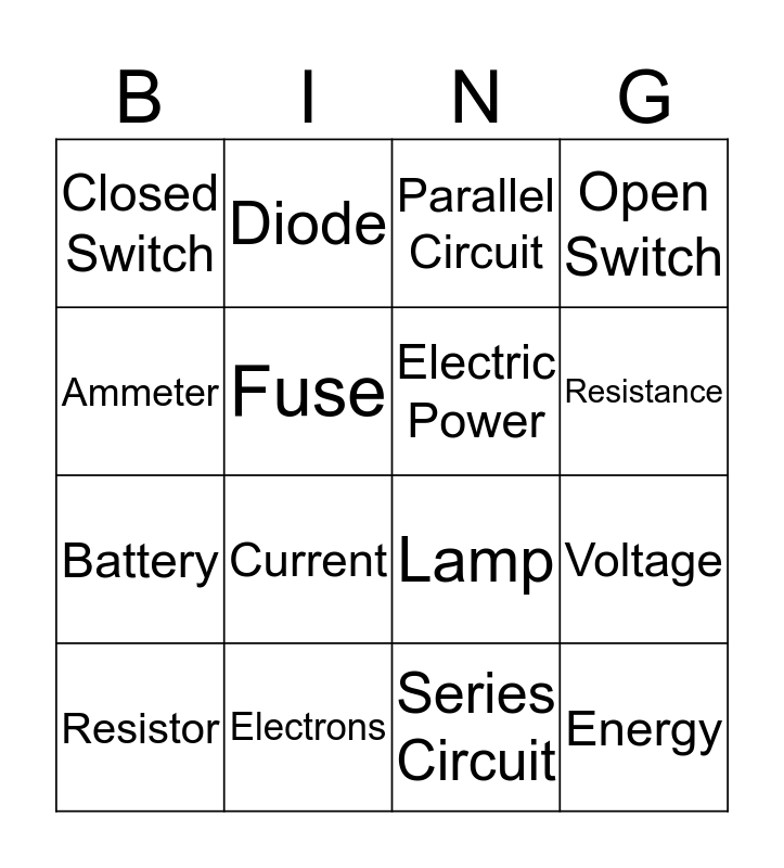 This bingo card has 16 words: Electrons, Voltage, Parallel Circuit, Closed Switch, Battery, Diode, Lamp, Series Circuit, Ammeter, Fuse, Resistor, Open Switch, Current, Resistance, Electric Power and Energy.