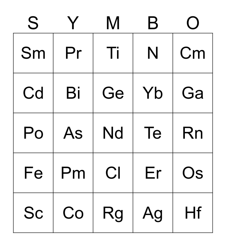 This bingo card has 118 words: H, He, Li, Be, B, C, N, O, F, Ne, Na, Mg, Al, Si, P, S, Cl, Ar, K, Ca, Sc, Ti, V, Cr, Mn, Fe, Co, Ni, Cu, Zn, Ga, Ge, As, Se, Br, Kr, Rb, Sr, Y, Zr, Nb, Mo, Tc, Ru, Rh, Pd, Ag, Cd, In, Sn, Sb, Te, I, Xe, Cs, Ba, Hf, Ta, W, Re, Os, Ir, Pt, Au, Hg, Tl, Pb, Bi, Po, At, Rn, Fr, Ra, La, Ce, Pr, Nd, Pm, Sm, Eu, Gd, Tb, Dy, Ho, Er, Tm, Yb, Lu, Ac, Th, Pa, U, Np, Pu, Am, Cm, Bk, Cf, Es, Fm, Md, No, Lr, Rf, Db, Sg, Bh, Hs, Mt, Ds, Rg, Cn, Nh, Fl, Mc, Lv, Ts and Og.