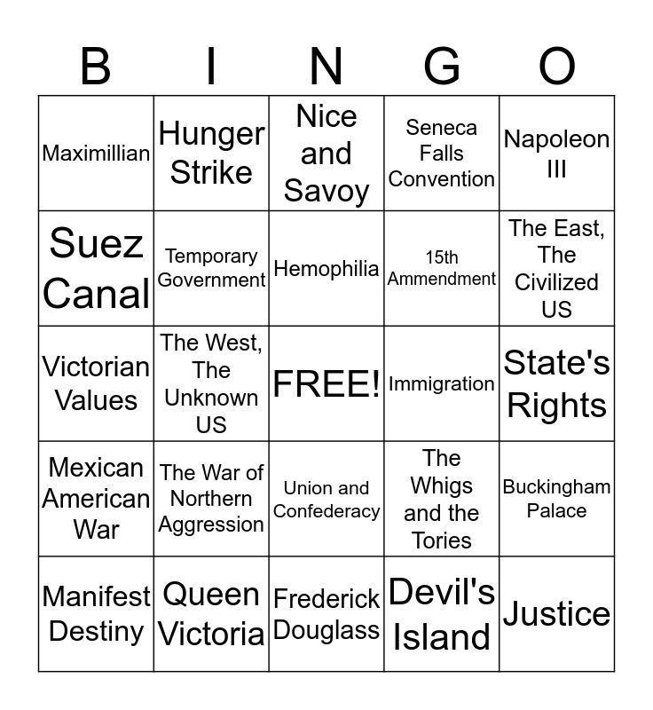 This bingo card has a free space and 24 words: The War of Northern Aggression, Queen Victoria, Hemophilia, Manifest Destiny, Napoleon III, Maximillian, Suez Canal, Hunger Strike, Immigration, Union and Confederacy, 15th Ammendment, Victorian Values, The Whigs and the Tories, Buckingham Palace, Temporary Government, Devil's Island, State's Rights, Nice and Savoy, The East, The Civilized US, The West, The Unknown US, Justice, Mexican American War, Seneca Falls Convention and Frederick Douglass.