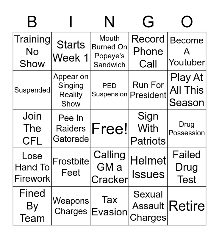 This bingo card has a free space and 24 words: Frostbite Feet, Weapons Charges, PED Suspension, Fined By Team, Become A Youtuber, Training No Show, Suspended, Starts Week 1, Sign With Patriots, Calling GM a Cracker, Run For President, Join The CFL, Helmet Issues, Failed Drug Test, Appear on Singing Reality Show, Sexual Assault Charges, Drug Possession, Mouth Burned On Popeye's Sandwich, Play At All This Season, Pee In Raiders Gatorade, Retire, Lose Hand To Firework, Record Phone Call and Tax Evasion.