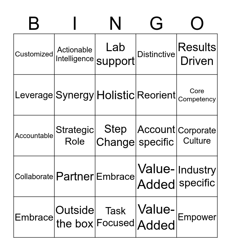 This bingo card has 25 words: Collaborate, Outside the box, Step Change, Value-Added, Results Driven, Customized, Actionable Intelligence, Lab support, Account specific, Industry specific, Leverage, Synergy, Task Focused, Value-Added, Core Competency, Embrace, Strategic Role, Holistic, Reorient, Corporate Culture, Accountable, Partner, Embrace, Distinctive and Empower.