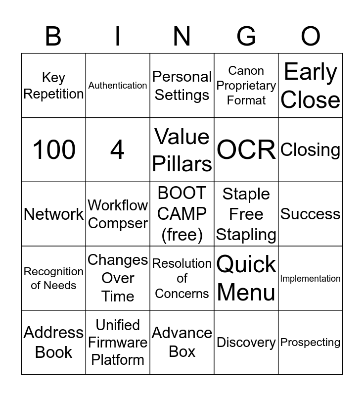 This bingo card has a free space and 31 words: Advance Box, Mailbox, Workflow Compser, 16 GB, Key Repetition, Personal Settings, 4, Quick Menu, Staple Free Stapling, Discovery, Success, Prospecting, Qualification, Solution, Closing, Re-evaluation, Implementation, Changes Over Time, Recognition of Needs, Resolution of Concerns, Early Close, Questions, Address Book, Authentication, OCR, 100, Canon Proprietary Format, Network, Unified Firmware Platform, Value Pillars and New Workflow Process.