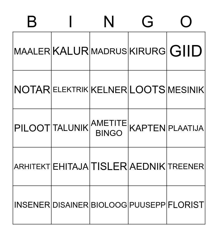 This bingo card has a free space and 34 words: PAGAR, PUUSEPP, TREIAL, JUUKSUR, ARHITEKT, ELEKTRIK, GIID, INSENER, KALUR, KAEVUR, KELNER, MADRUS, KINGSEPP, KOKK, KAPTEN, MESINIK, DISAINER, PILOOT, EHITAJA, AEDNIK, TISLER, RÄTSEP, MAALER, PLAATIJA, BIOLOOG, FLORIST, KIRURG, KULLER, LOOTS, NOTAR, SEPP, TALUNIK, TREENER and TELLER.