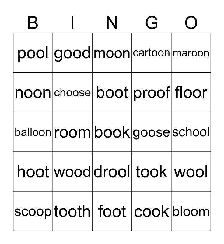 This bingo card has 29 words: scoop, look, room, bloom, pool, moon, choose, wood, goose, tooth, school, book, foot, cook, floor, food, drool, hoot, maroon, balloon, took, aloof, proof, noon, cartoon, good, wool, boot and broom.