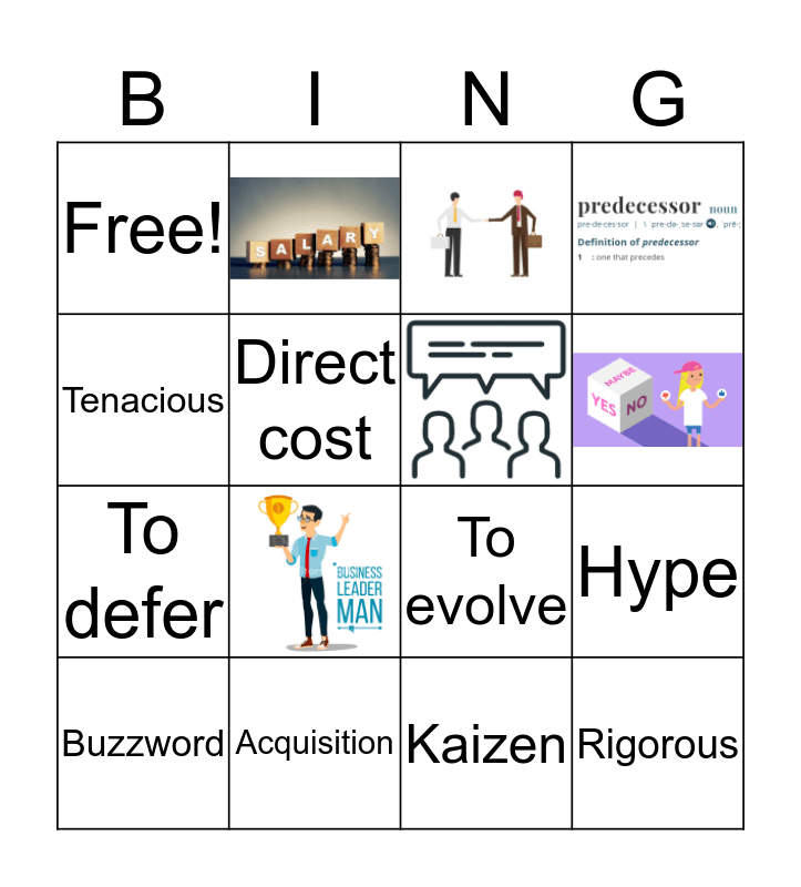 This bingo card has 6 images and 10 words: Buzzword, Acquisition, Tenacious, To evolve, Hype, Free!, Direct cost, Kaizen, To defer and Rigorous.
